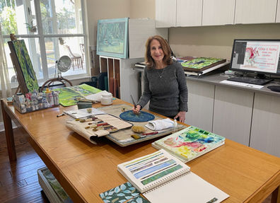 “A perfect day in my studio may look like this: an acrylic painting on my easel, a mural in-progress on my computer, a brochure project for a non-profit in the works, while a watercolor painting lays drying on the table.” "