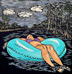 I am a Florida artist and printmaker whose handmade limited-edition linoleum block prints take a nostalgic dive into a wacky world of alligators and flamingos, mermaids and swamp creatures, fruit stands and funky motels. Through whimsical compositions, luminous colors and the rustic texture of the linocut, I aspire to capture the charm and allure of Old Florida’s rich cultural heritage.